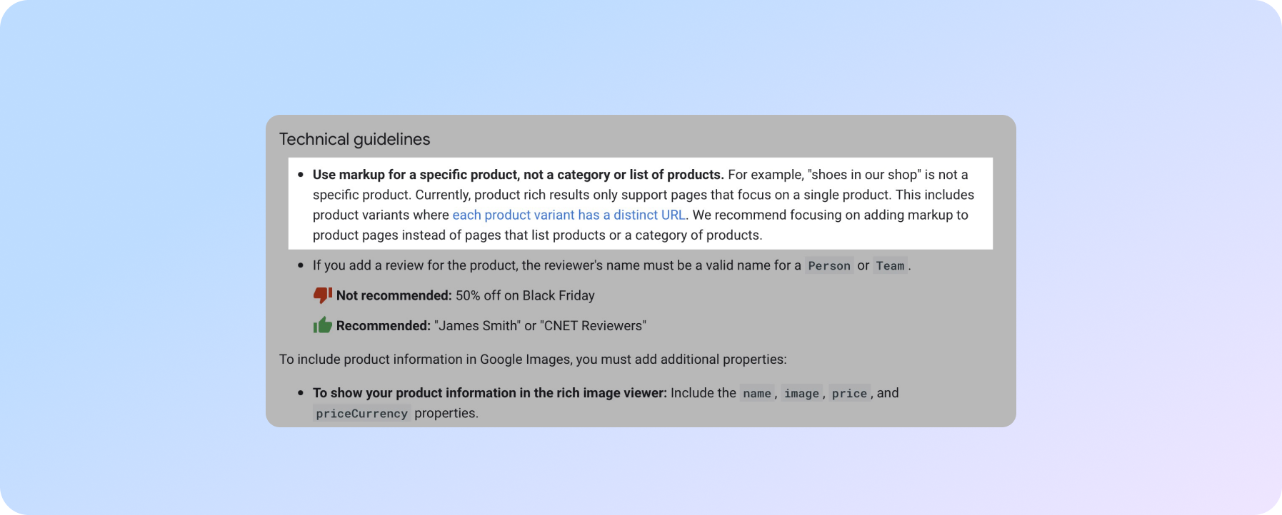 Щодо оглядів, Google згадує в технічних рекомендаціях не додавати розмітку огляду, якщо основним змістом є елементи списку категорій.