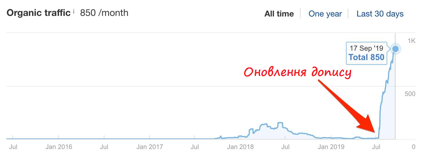 Наприклад, нещодавно ми оновили наш допис про те, як отримати більше трафіку на сайт, і органіка буквально пробила стелю.