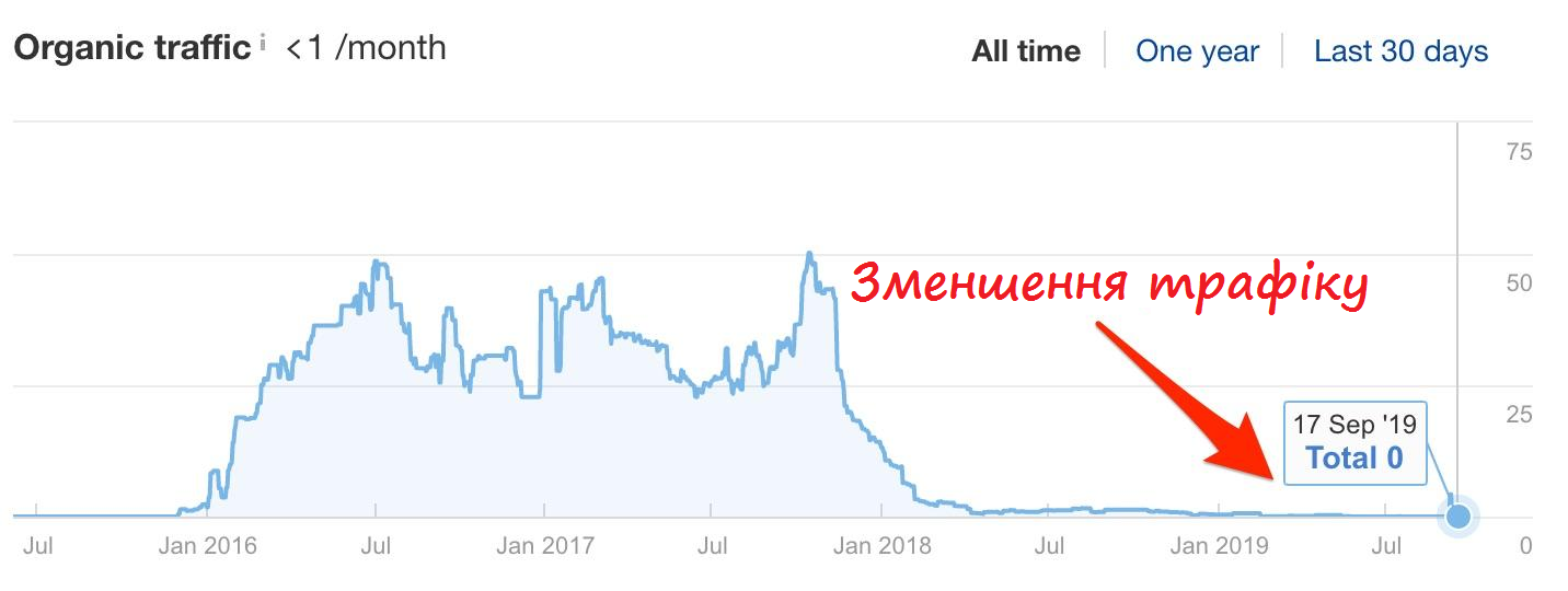 Якщо у вас встановлено Google Analytics, то ви легко можете знайти сторінки, в яких зменшується трафік. Якщо ж ні, вставте кілька ваших старих сторінок до Ahrefs Site Explorer і подивіться на графік органічного трафіку у звіті «Огляд».