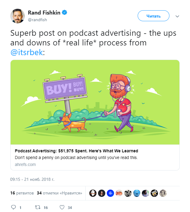 Через чотири роки Ренд твітнув нашу статтю про рекламу в подкастах, хоча ми й не повідомляли йому про цю публікацію.