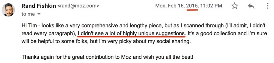 Чотири роки тому Тім, наш директор з маркетингу, написав епічну статтю на 5000 слів про стратегічний стиль письма. Він звернувся до Ренда Фішкіна, лідера думок у сфері SEO та маркетингу, сподіваючись, що той поділиться статтею зі своєю аудиторією.