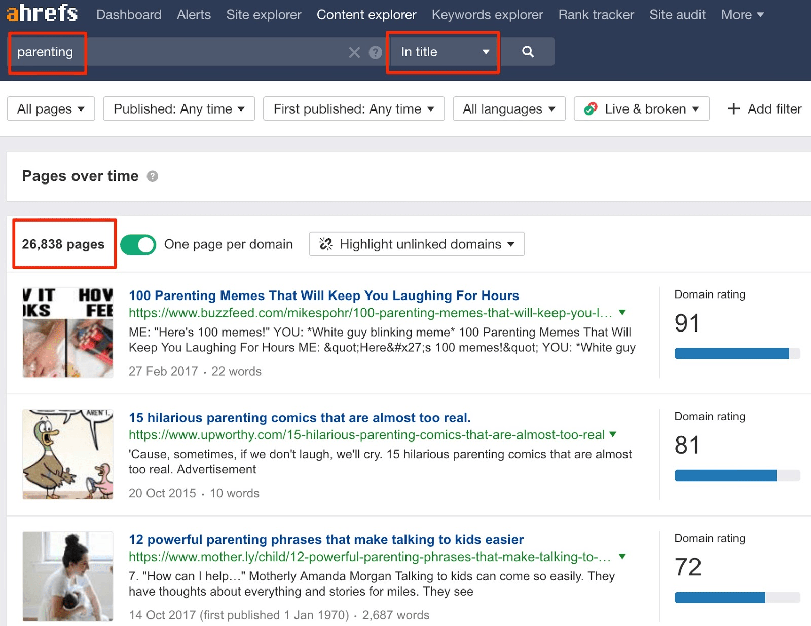 Щоб знайти ці сайти, введіть відповідні слова або фрази в Content Explorer і оберіть «одна стаття на домен». Це допоможе не зв'язуватися з одними й тими самими сайтами двічі.