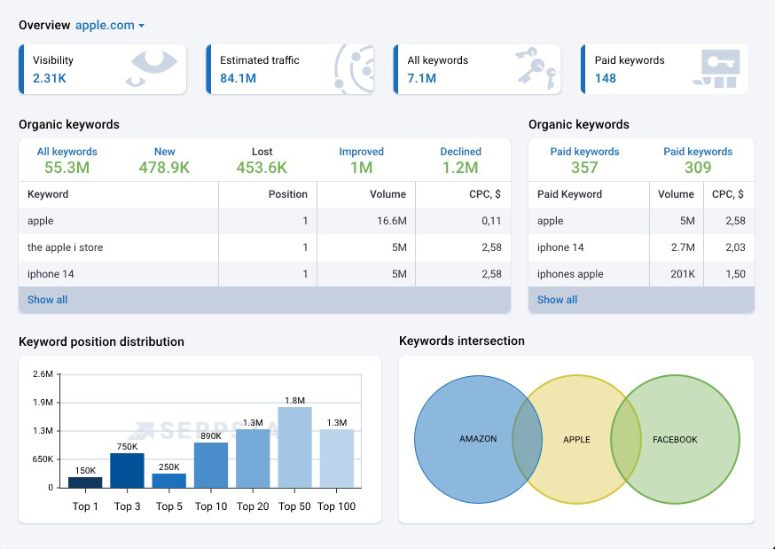 Він чудово підходить для збору семантичного ядра ключових запитів, а також для оцінки та аналізу інших важливих показників, серед яких трафік сайту, позиції конкурентів у пошуковій видачі Google, вартість за клік і.т.д.