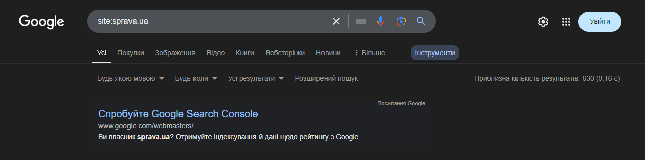 Або введіть “host” + адресу сайту — цей оператор не враховує піддомени і не показує їх у результатах. Це допомагає звузити пошук до конкретного домену.