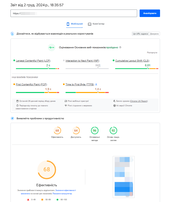 В рамках аналізу рекомендуємо перевірити швидкість завантаження головної сторінки, сторінки категорій, підкатегорій, картки товарів, сторінки блогу тощо. Необхідно звернути увагу, як на мобільну версію сайту так і десктопну.