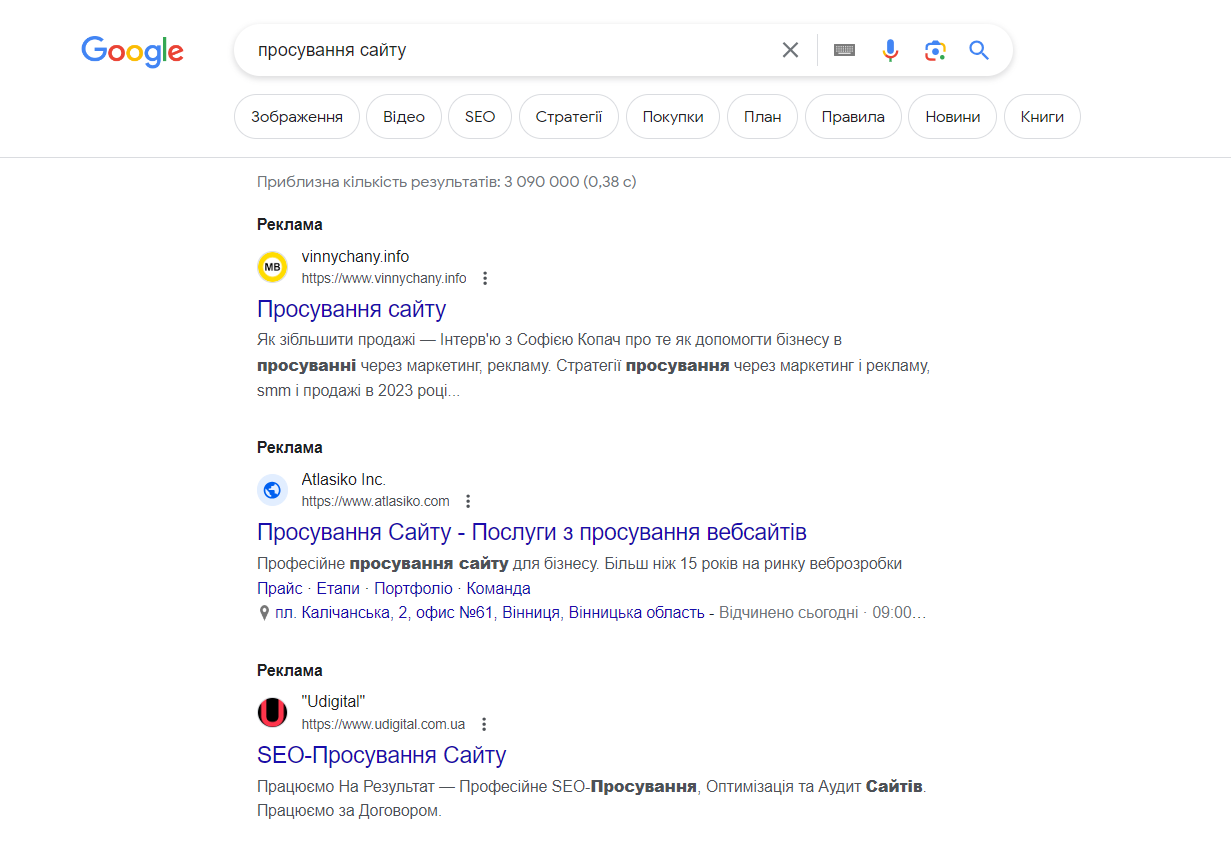 Важливо відзначити, що обидва типи просування з'являються в результатах пошуку, однак перший – платна реклама, тоді як другий – результат, згенерований алгоритмом Google. Вони можуть доповнювати один одного та використовуватися разом для досягнення максимального ефекту.