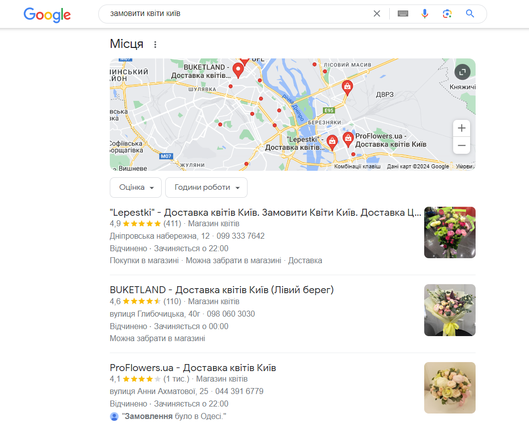 Навіть значне зростання електронної комерції не змусило користувачів постійно купувати в мережі, тому вони продовжують шукати компанії поблизу та купувати “наживо”. І Google намагається активно розвивати локальний пошук, щоб показати користувачу найбільш підходящий результат у вигляді картки компанії в Google Бізнес-профілі з рейтингом, відгуками та фото.