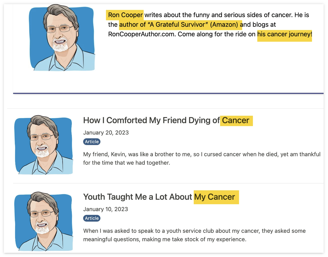Це сторінка автора у блозі про допомогу в боротьбі з раком (тема YMYL). Біографія автора вказує на особистий досвід з цією хворобою.