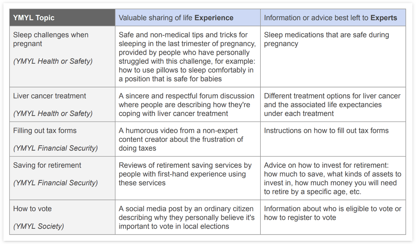 Іншими словами, якщо особистий досвід є фундаментальним для встановлення довіри на цю тему, автор не повинен бути експертом. Google надає зручний список прикладів, щоб краще зрозуміти цей нюанс (QRG, сторінка 28):