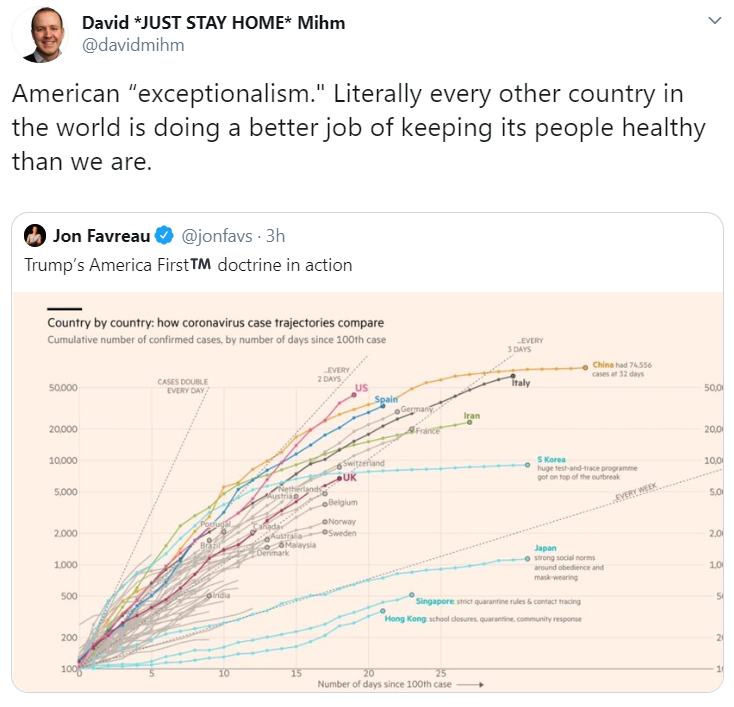 - США можуть слідувати тією ж дорогою, що і Китай, Тайвань, Південна Корея, Данія, Німеччина, Франція і багато інших країн, щоб захистити здоров’я і майбутнє економіки, але внаслідок унікальних причин для американської політики, культури та існуючої мережі безпеки в нас це не вийде.