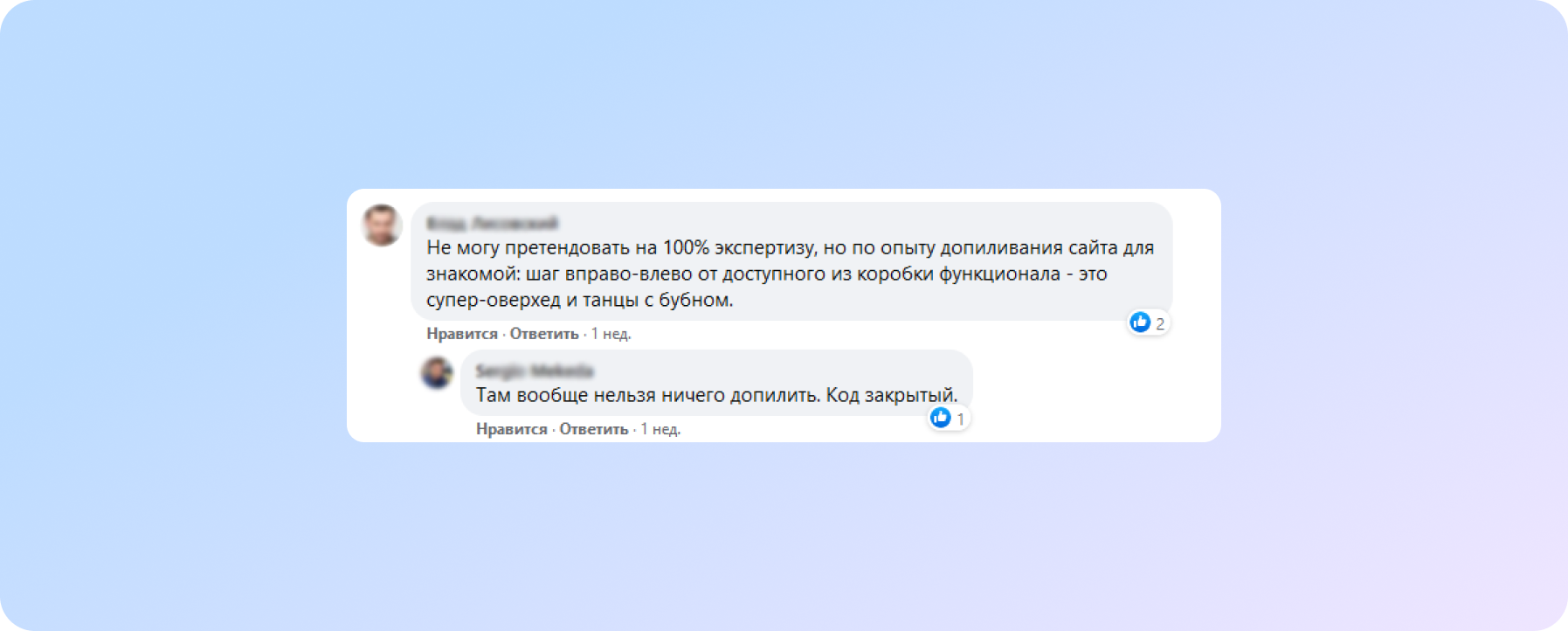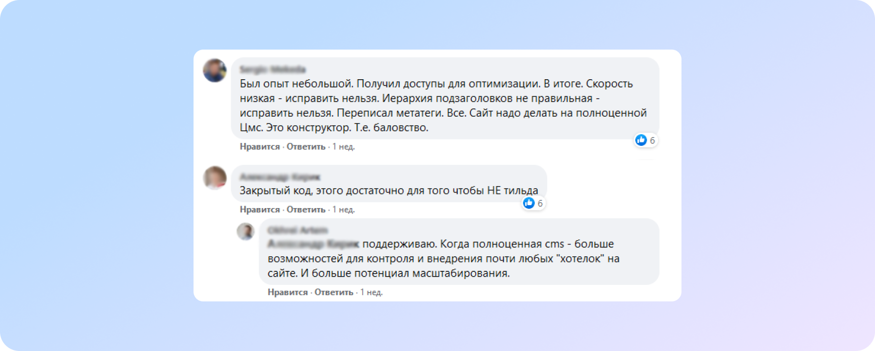 Ми розглянули декілька найболючіших питань, з якими ми стикались з сайтами на Тільді. Що ми бачимо тут? Здається, все що має працювати на благо бізнесу - обмежено у Тільді. То й не дивно, враховуючи країну-розробника.
