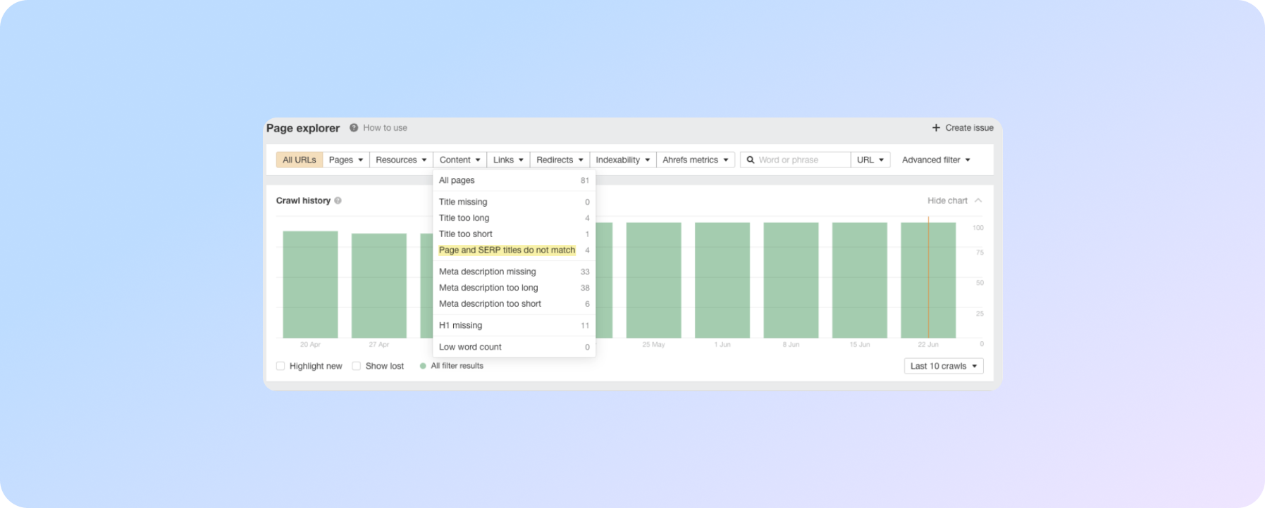 Ви можете швидко знайти сторінки з невідповідними Title в Аhrefs Site Audit. Перейдіть до Page Explorer. Виберіть"Content" у випадаючому меню та натисніть параметр "Title too long".