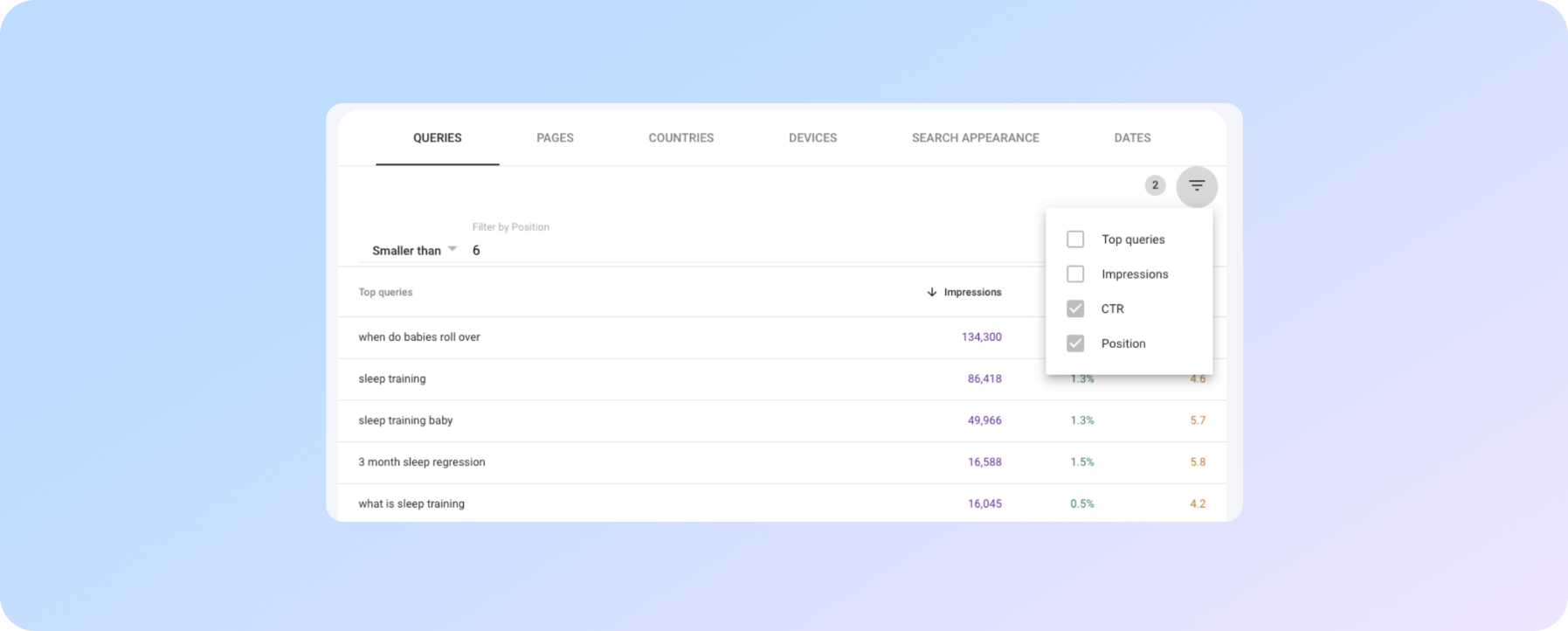У верхньому правому куті таблиці пошукової консолі знаходиться кнопка із зображенням трьох ліній; клікніть по ній, щоб сегментувати ваші дані за допомогою пунктів "position lower than 6" і "CTR lower than (вставте тут середній CTR)".