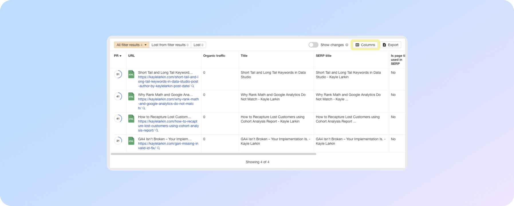 Сторінки, де заголовок не відповідає заголовку SERP, будуть відображатися в таблиці. У верхньому правому куті таблиці клікніть "Columns".