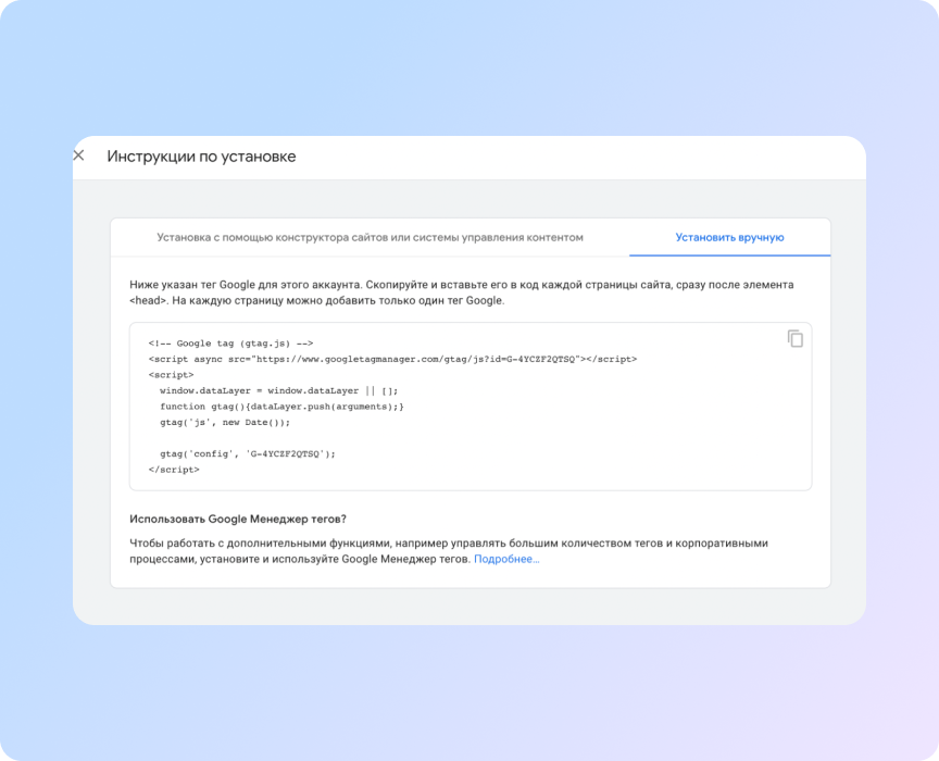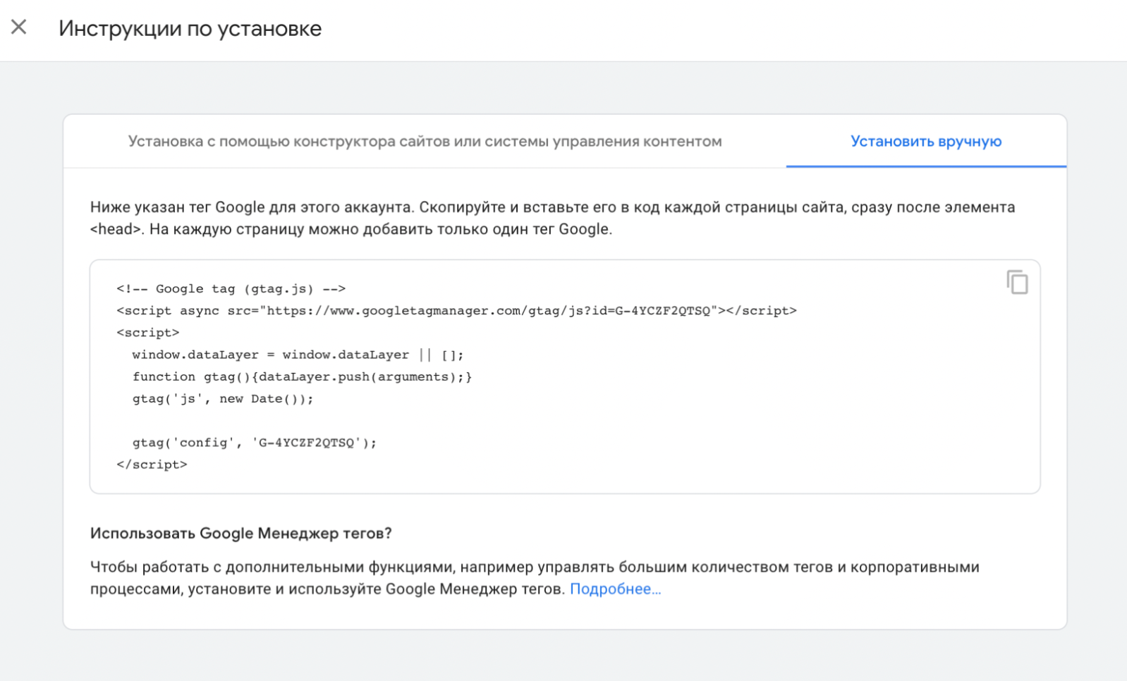 - після створення потоку даних ви отримаєте код відстеження GA 4. Цей код потрібно встановити на всіх сторінках вебсайту: це можна зробити вручну, вставивши в тег <header> або за допомогою плагіну, що є у вашій CMS;