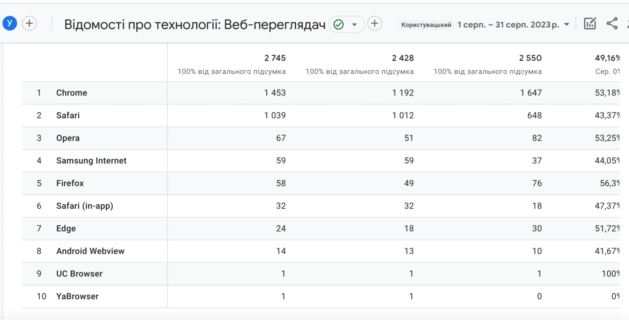 Цей звіт надає інформацію про браузери, якими переважно користуються ваші відвідувачі. Отримавши ці дані, ви зможете належним чином оптимізувати сайт.