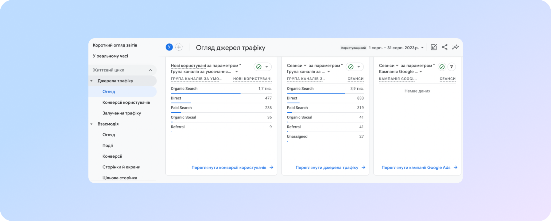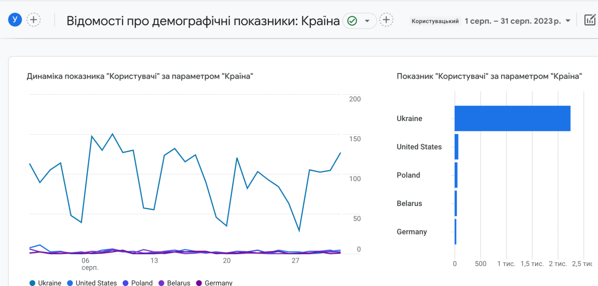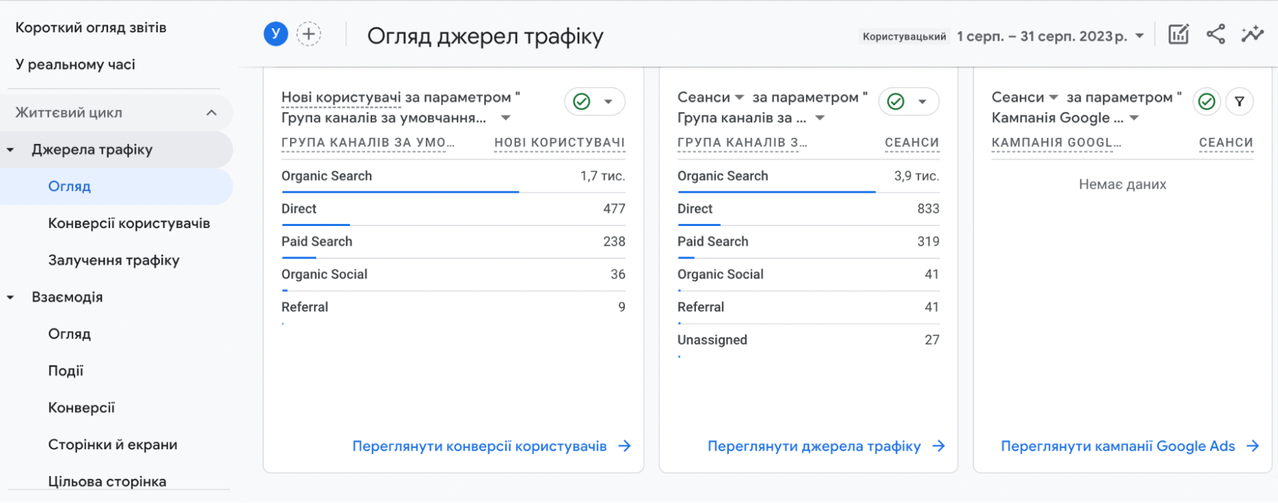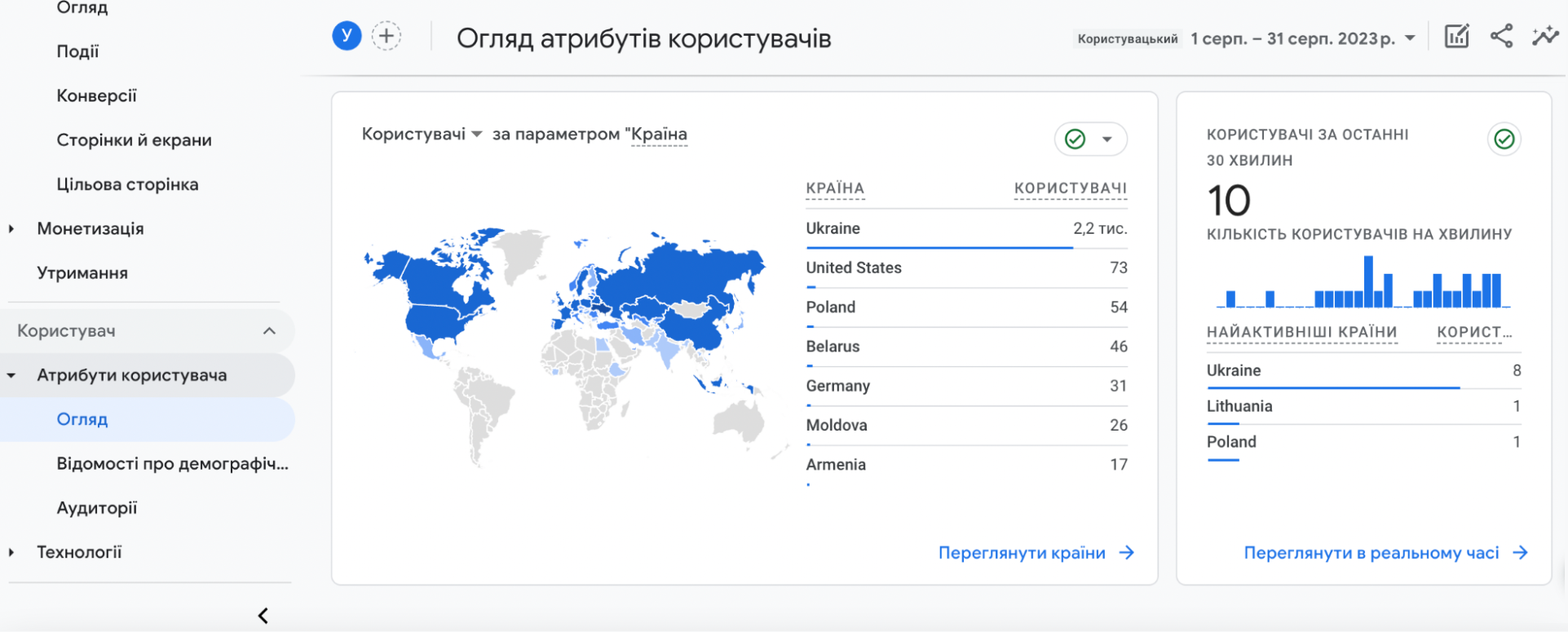 Ви маєте змогу проаналізувати органічний пошук, прямий та соціальний трафік або подивитися, в якій країні знаходиться користувач. Також можна дізнатися, які сторінки, товари чи послуги цікавили юзерів, і виявити найпопулярніші з них.