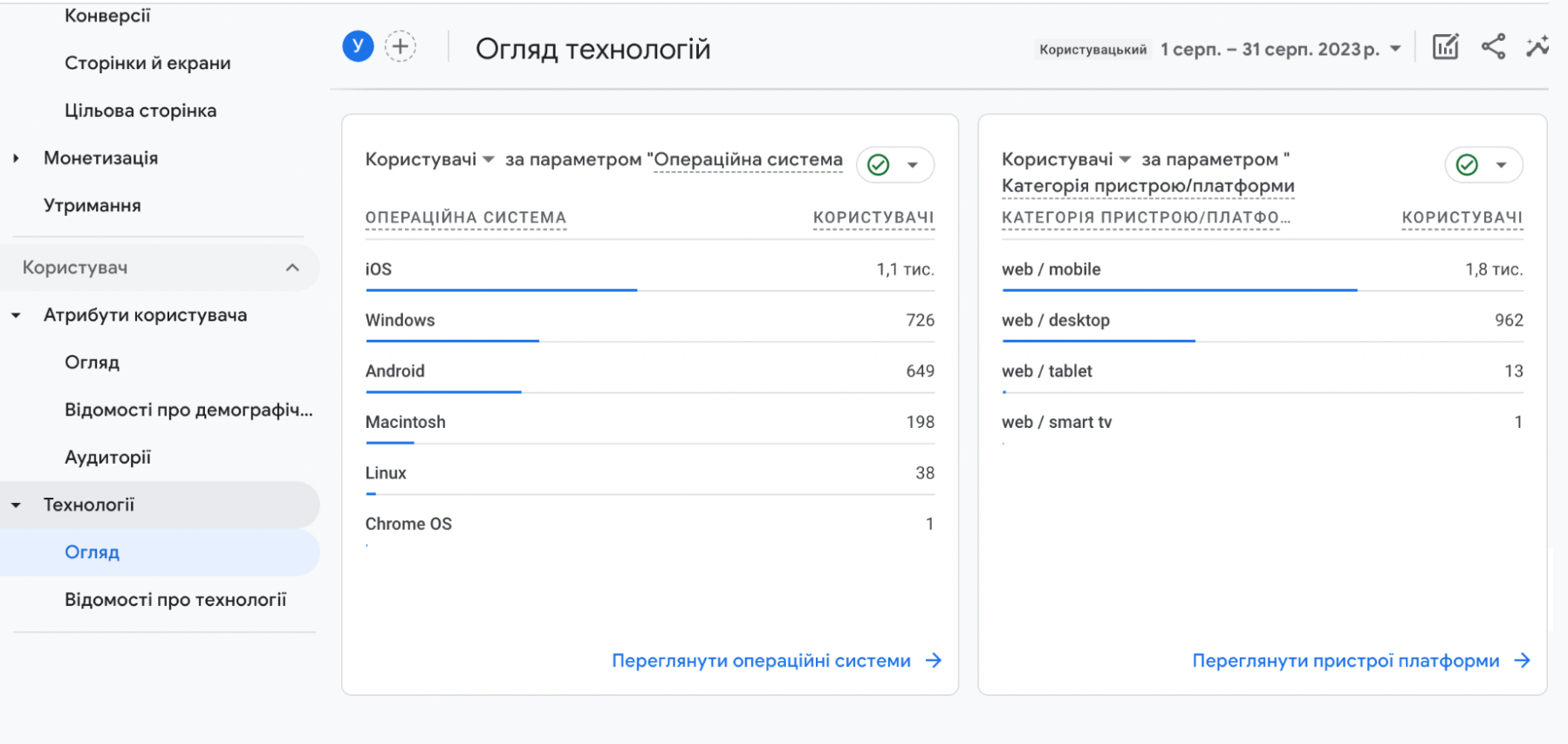 Така інформація допомагає зрозуміти, які пристрої, операційні системи та браузери використовують ваші потенційні й наявні клієнти. Це дозволить вам оптимізувати онлайн-ресурс під різні девайси та усунути технічні проблеми.