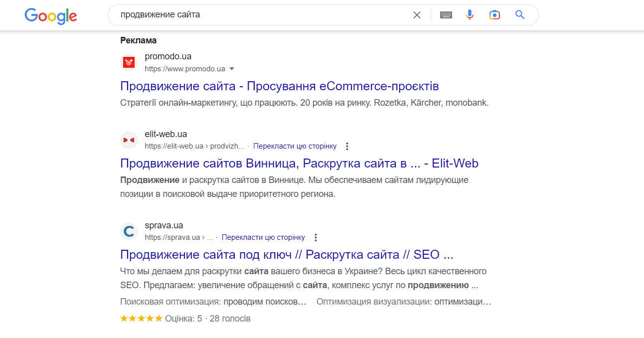 Приклад результатів видачі в пошуку Google