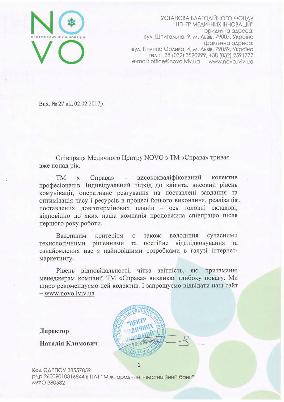 The level of responsibility, clear reporting, which are inherent in the managers of TM "Sprava", is deeply respected. We sincerely recommend this team. And we invite you to visit our website - www.novo.lviv.ua
