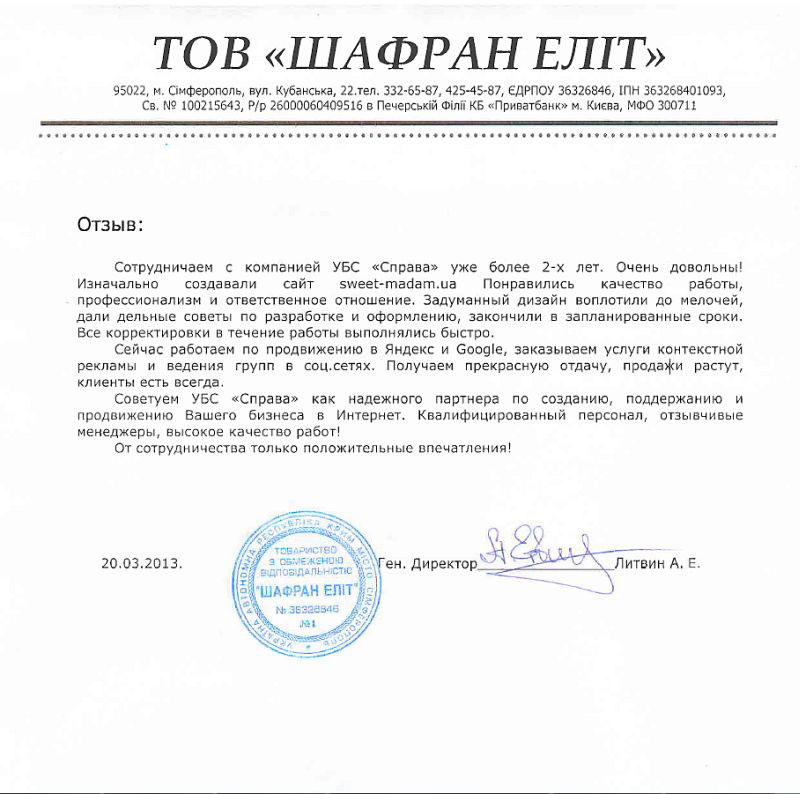 We recommend the "Sprava" company as a reliable partner for creating, maintaining and promoting your business on the Internet. Qualified staff, responsive managers, high quality work.