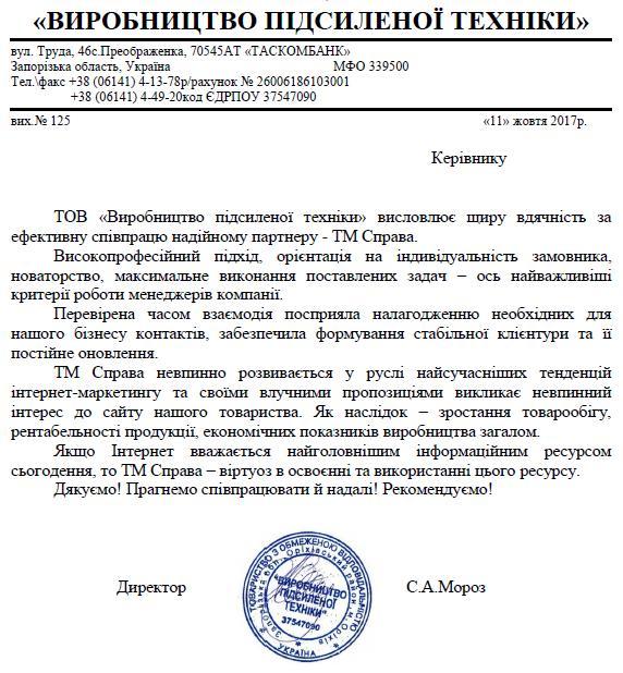LLC "Production of Reinforced Equipment" expresses its sincere gratitude for the effective cooperation of a reliable partner - TM Sprava.